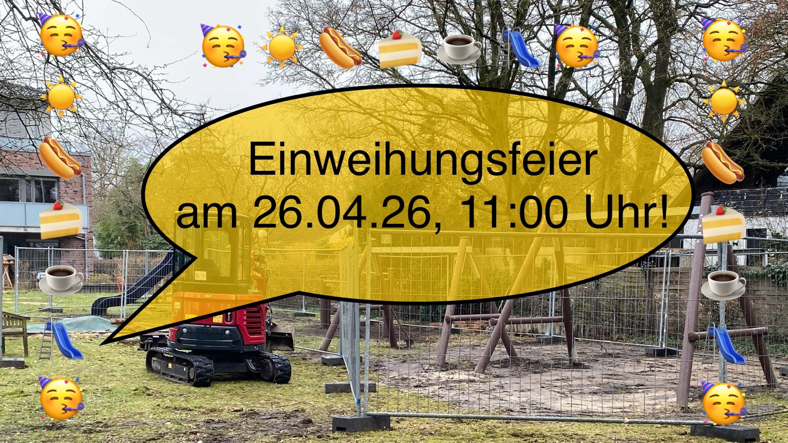 Im Anschluss an den Gottesdienst am 26.04.2026 eröffnen wir unseren erneuerten Spielplatz mit einem gemeinsamen Mittagessen, Kaffee und Kuchen und natürlich ganz viel Spiel und Spaß mit den neuen Spielgeräten.